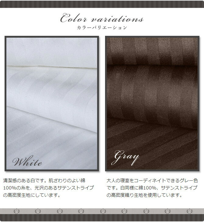 サテンストライプ織りの生地は、平織りと違って光の加減で生地がいろんな表情をみせてくれインテリア性も高くなり、ご自宅の寝室をホテルのように演出することも可能になります。